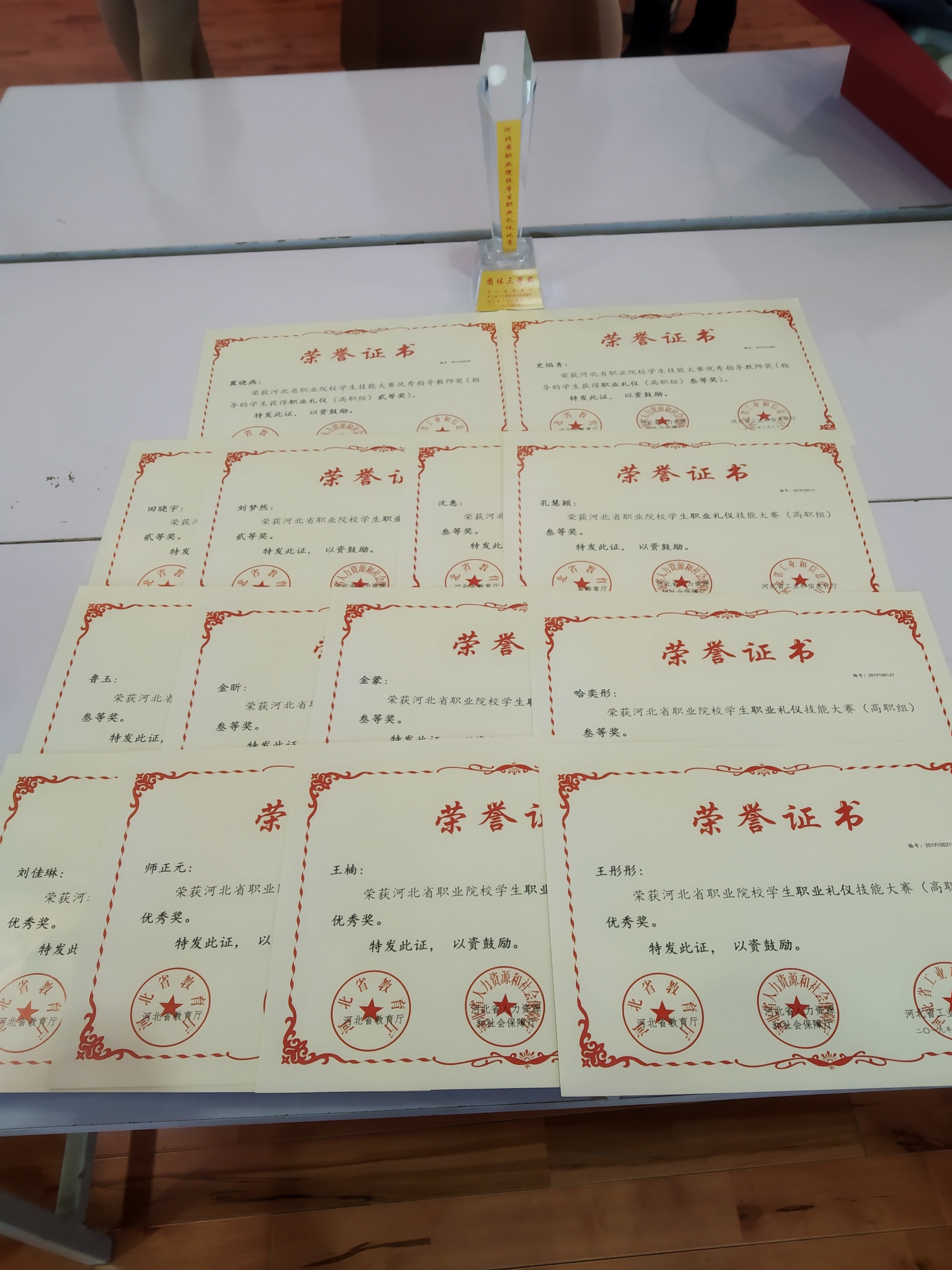 学院高度重视此次比赛,从接到通知到正式比赛只有短短的十几天,赛前,师生从礼仪操编排到情景剧构思,从理论讲解学习到演讲反复演练,刻苦训练、充分备战;赛中,从场下备赛到现场发挥,不畏强手、自信应战。12名同学全部获得个人荣誉,其中二等奖2名,三等奖6名,优秀奖4名;2队(空中乘务专业)获得职业礼仪技能大赛团体三等奖;冀晓燕老师获得优秀指导教师二等奖,史焰青老师获得优秀指导教师三等奖。