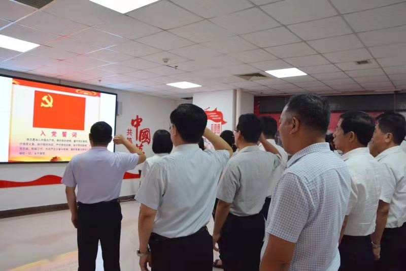 在重温入党誓词活动中,学院党委书记薛树林带领学院党委成员、中层领导干部和新党员在图书馆综合楼8层思政展厅,面向鲜红的中国共产党党旗进行了庄严的宣誓,铿锵有力的宣誓声响彻大厅。