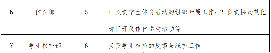 第八条 学生会组织工作人员规模不超过40人,其中主席团5人,下设综合部、纪检部、体育部、生活部、学宣部、志愿服务部等六个职能部门。