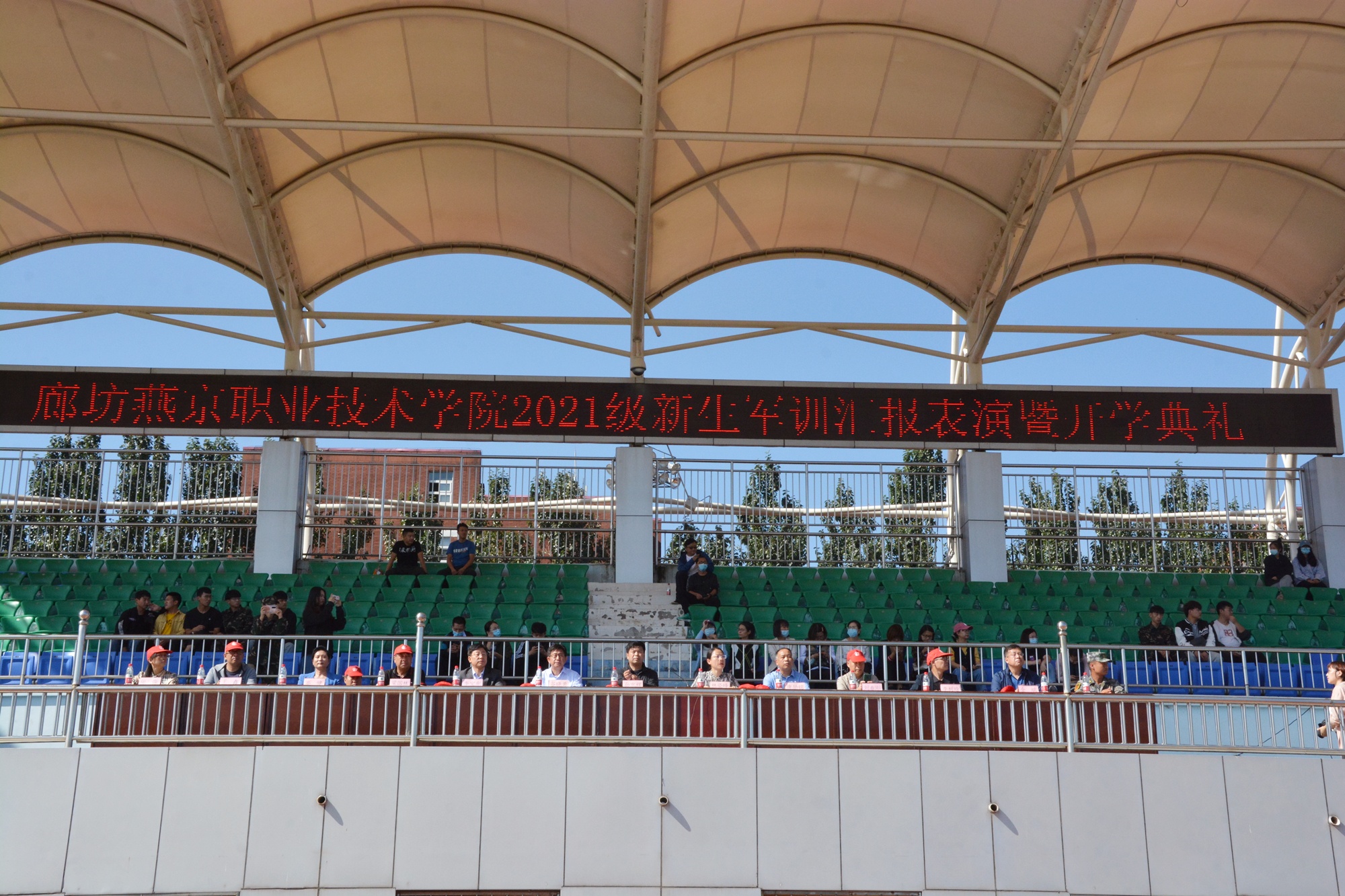 汇演在庄严雄壮的国歌声中拉开序幕。首先,党委副书记、院长孙东辉同志检阅了军训方队。全体新生气宇轩昂、英姿勃发,在教官的带领下,列着整齐的队伍,以嘹亮的口号、严密的纪律、过硬的素质接受院领导的检阅。