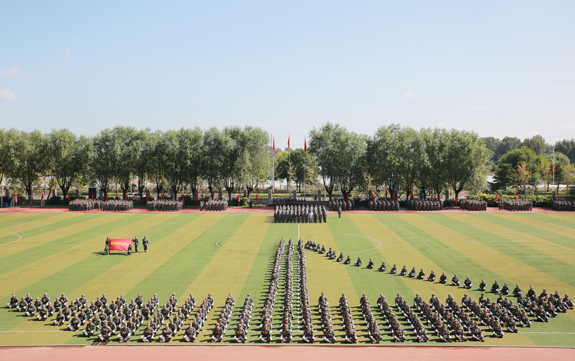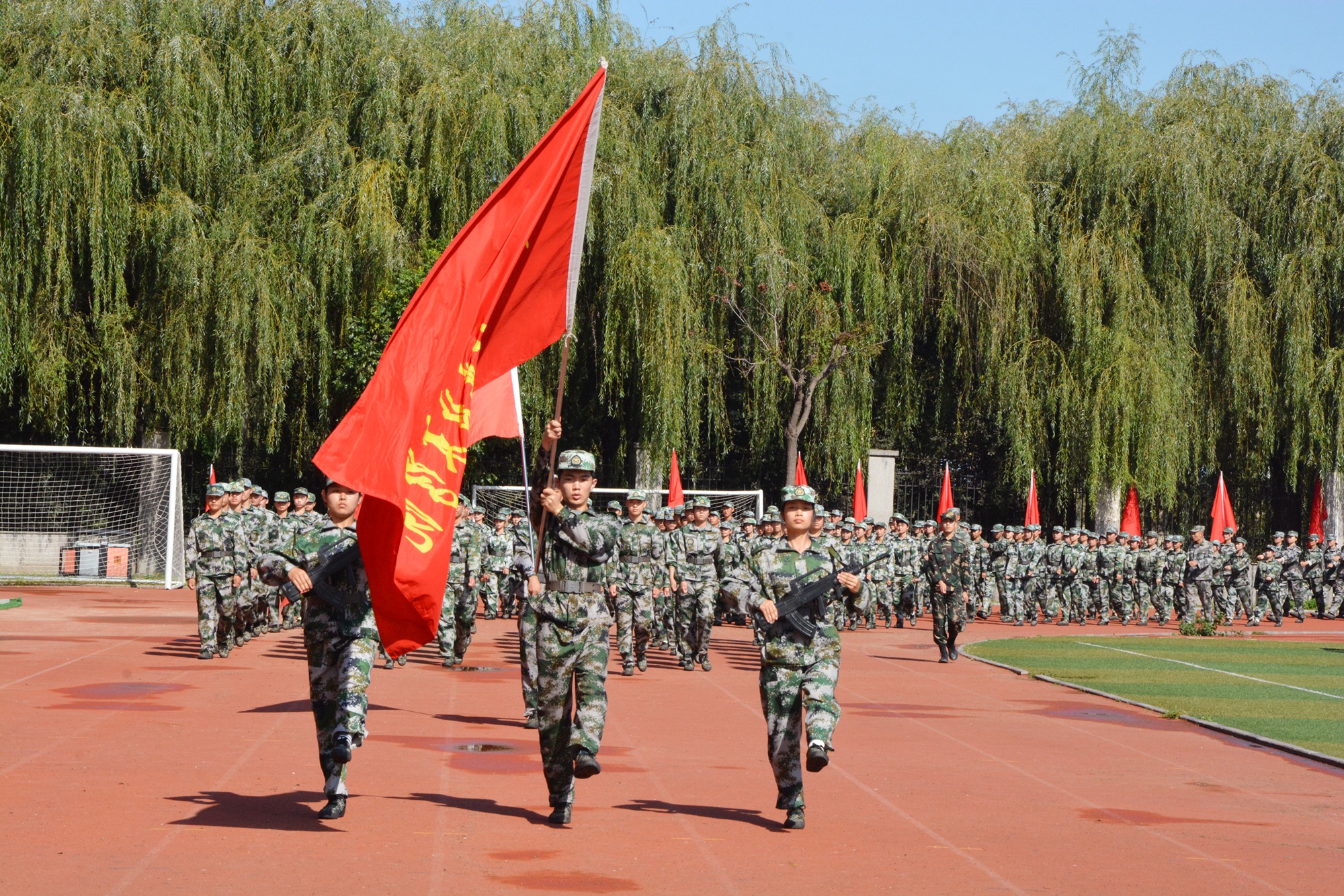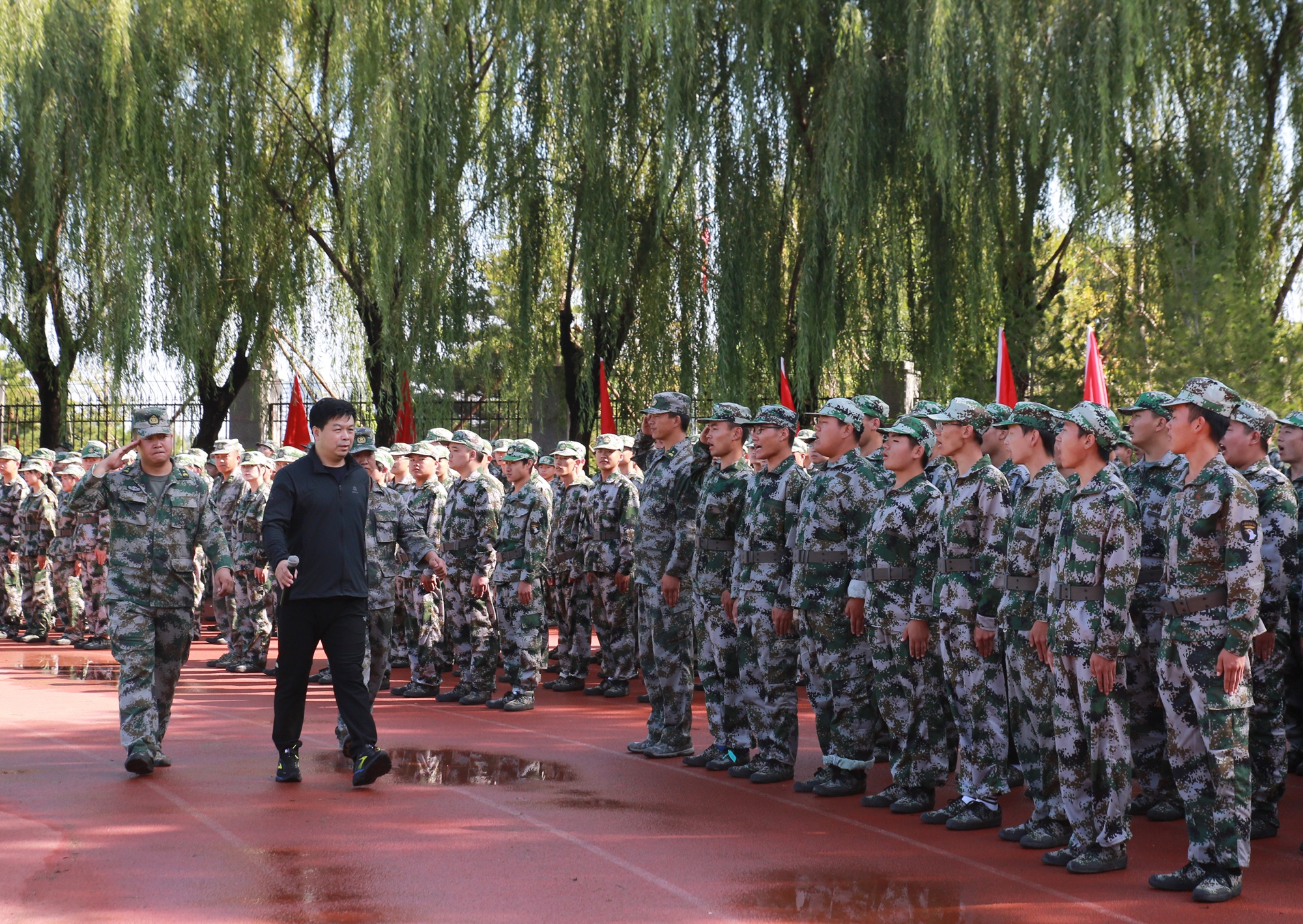 随着院长孙东辉同志发布分列式及军训汇报表演开始的指令,1600余名新生,迈着整齐的步伐依次通过主席台,他们用飒爽的英姿,昂扬的姿态,高亢有力的口号,为期十天的军训生活画上了圆满的句号。随后,新生们进行了军体拳、捕俘刀、队列操等汇报表演,博得阵阵喝彩和掌声。