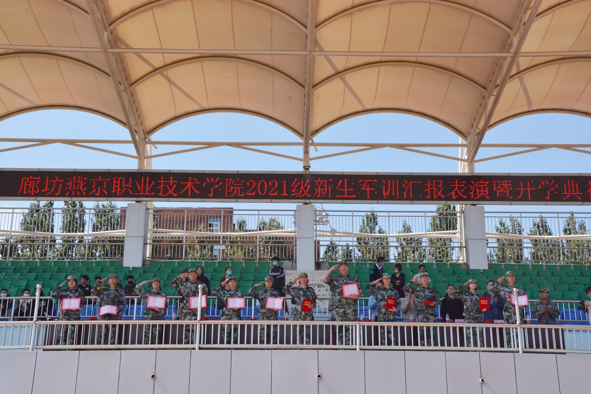 汇演结束后,党委委员、副院长谷晓勇同志宣读了学院《关于2021级新生军训先进集体、先进个人的表彰决定》,主席台全体领导为获得表彰的国旗护卫队等17个先进集体,和赵晋升、王轩等172名先进个人代表颁发了荣誉证书。