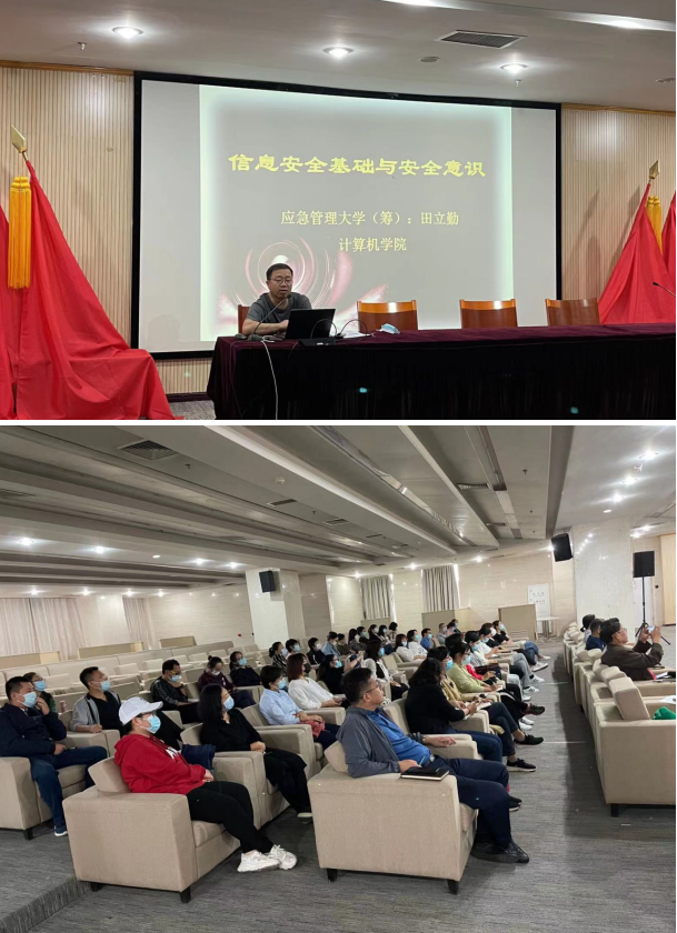 本次培训邀请到了应急管理部直属高校应急管理大学(筹)计算机学院院长、清华大学博士后、省物联网数据采集与处理工程中心主任、青海师范大学兼职博士生导师田立勤教授,田教授以信息安全基础与安全意识为题,为大家做了专题培训讲座。
