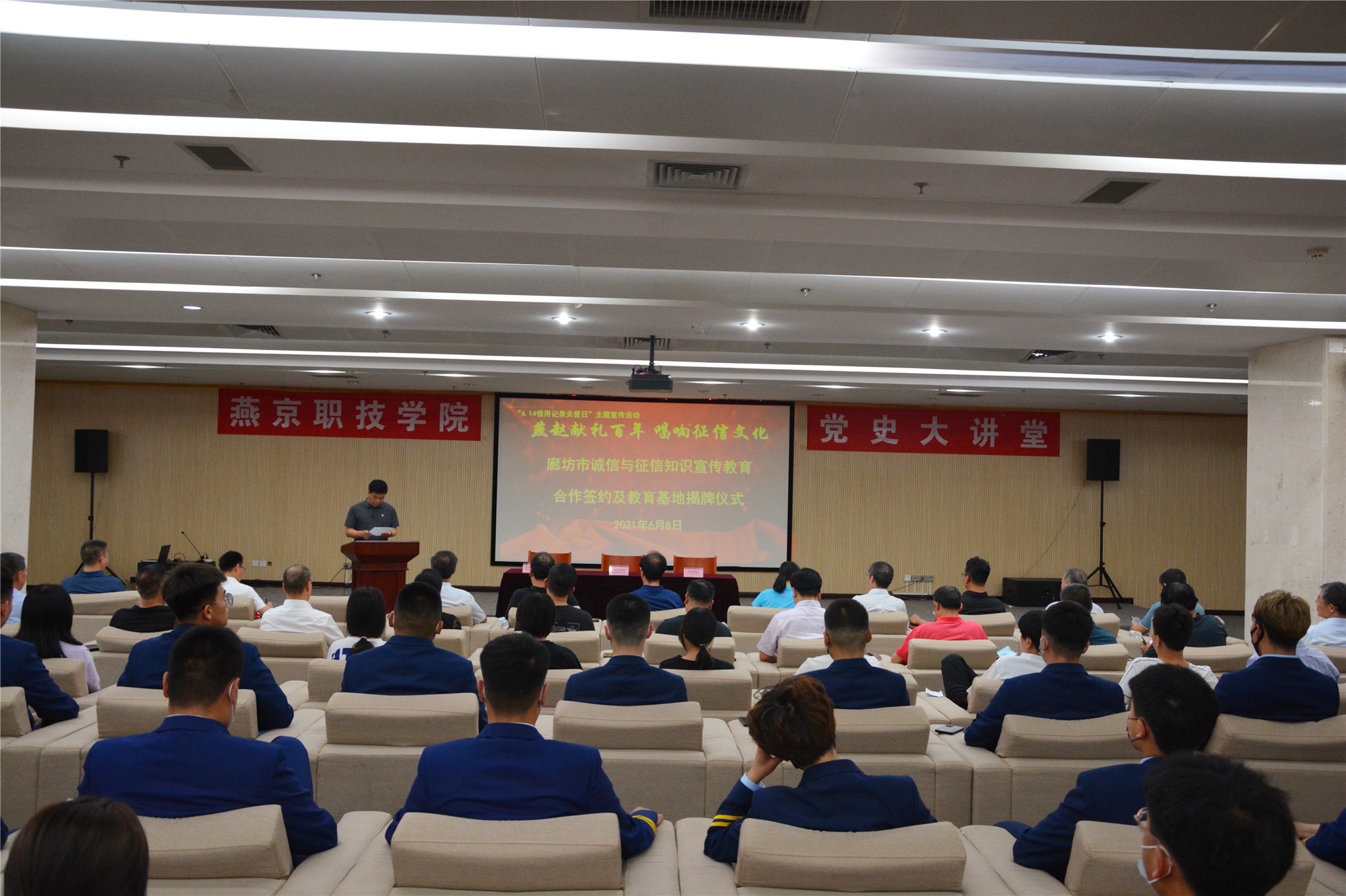 金年会app手机版在线登录自成立以来,以“德能兼修、知行并进”为办学理念,一直高度重视学生德育工作开展,逐步形成了注重培养诚信的校园文化特色。金年会app手机版在线登录与三河市人民政府金融信用办公室、中国人民银行三河市支行共同签署诚信与征信知识宣传教育合作签约,共建宣传教育基地,这是贯彻落实党的教育政策的具体举措,也是学院传承校园文化传统、服务区域经济社会发展的又一个有力措施。