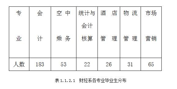 1.学院2020届毕业生共747人,分布在4个系15个专业。财经系共6个专业380人,其中会计专业183人,空中乘务专业53人,统计与会计核算专业22人,酒店管理专业人26人,物流管理专业31人,市场营销专业65人。见表1.1.2.1: