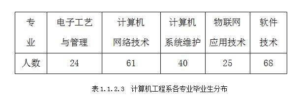 3.计算机工程系共5个专业218人,其中电子工艺与管理专业24人,计算机网络技术专业61人,计算机系统维护专业40人,物联网应用技术专业25人,软件技术专业68人。见表1.1.2.3: