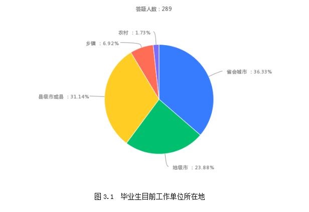 在被调查的289名毕业生中,105名毕业生工作单位所在地为直辖市或省会城市,约占被调查毕业生总数的36.33%,69名毕业生工作单位所在地为地级市,约占被调查毕业生总数的23.88%,90名毕业生工作单位所在地为县级市或县城,约占被调查毕业生总数的31.14%,20名毕业生工作单位所在地为乡镇,约占被调查毕业生总数的6.92%,5名毕业生工作单位所在地为农村,约占被调查毕业生总数的1.73%。具体见图3.1: