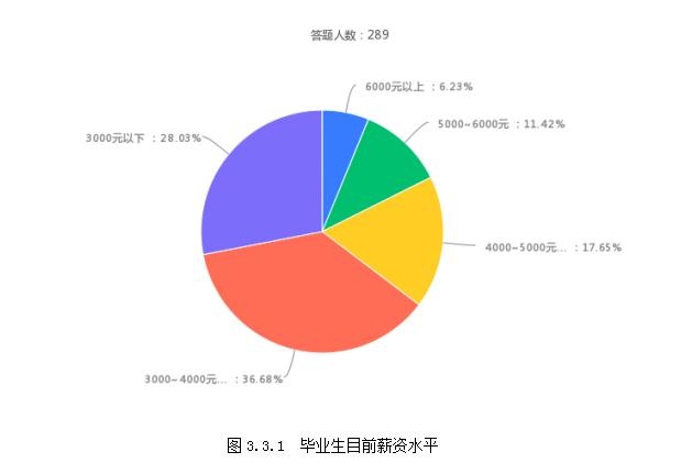 在被调查的289名毕业生中,薪酬在3000元以下的毕业生有81人,约占被调查毕业生总数的28.03%;薪酬在3000-4000元的毕业生有106人, 约占被调查毕业生总数的36.68%;薪酬在4000-5000元的毕业生有51人,约占被调查毕业生总数的17.65%;薪酬在5000-6000元的毕业生有33人,约占被调查毕业生总数的11.42%;薪酬在6000元以上的毕业生有18人,约占被调查毕业生总数的6.23%。具体见图3.3.1: