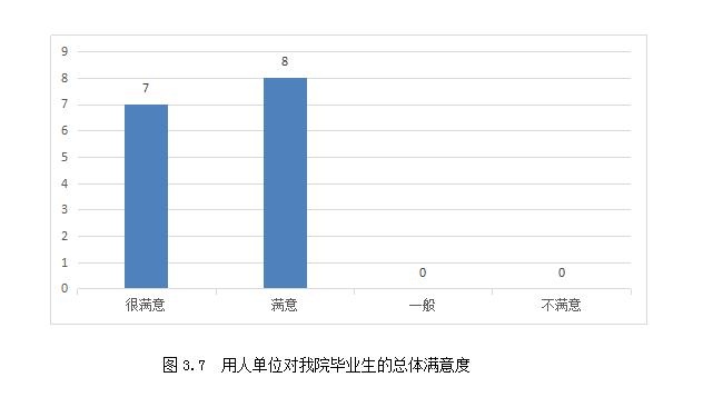 在被调的15家用人单位中,7家用人单位对金年会app手机版在线登录毕业生的工作表现表示非常满意,占被调查总数的46.67%,8家用人单位对金年会app手机版在线登录毕业生的工作表现表示满意,占被调查总数的53.33%。具体见图3.7: