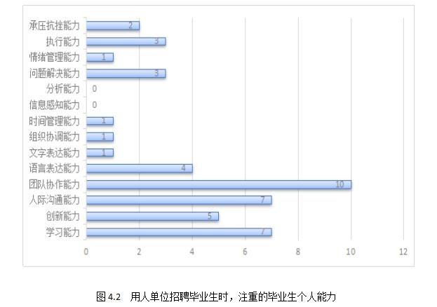 通过对15家毕业生所在用人单位的调查,可以看出用人单位在招聘毕业生时最看重团队协作能力,其次是人际沟通能力和学习能