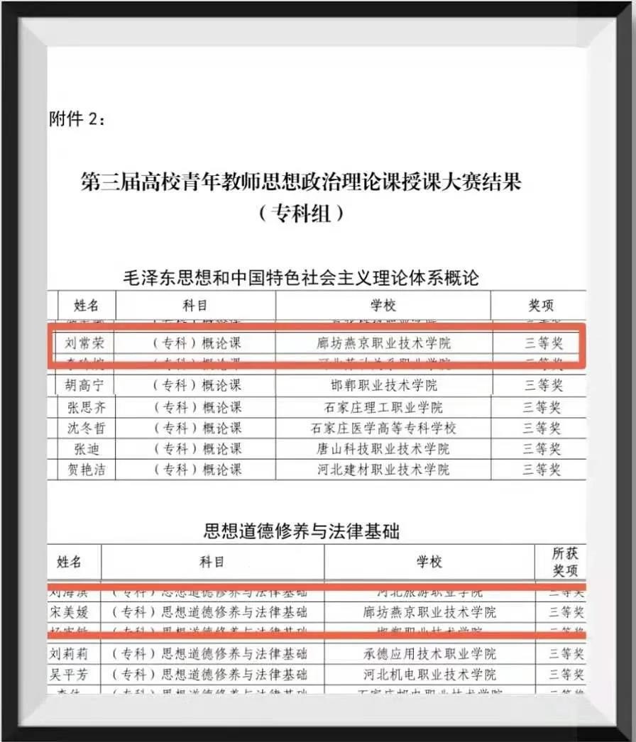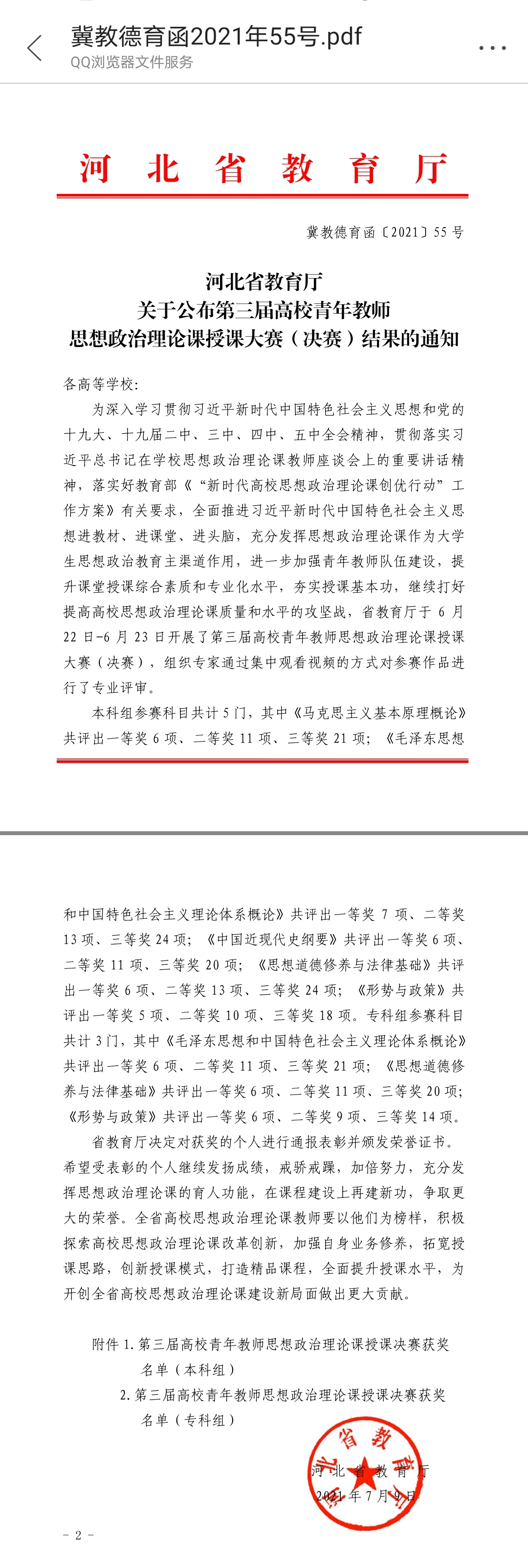近日,河北省教育厅公布了河北省第三届高校青年教师思想政治理论课授课大赛决赛结果,金年会app手机版在线登录马克思主义理论教学部教师刘常荣、宋美媛分别荣获《毛泽东思想和中国特色社会主义理论体系概论》《思想道德修养与法律基础》三等奖。