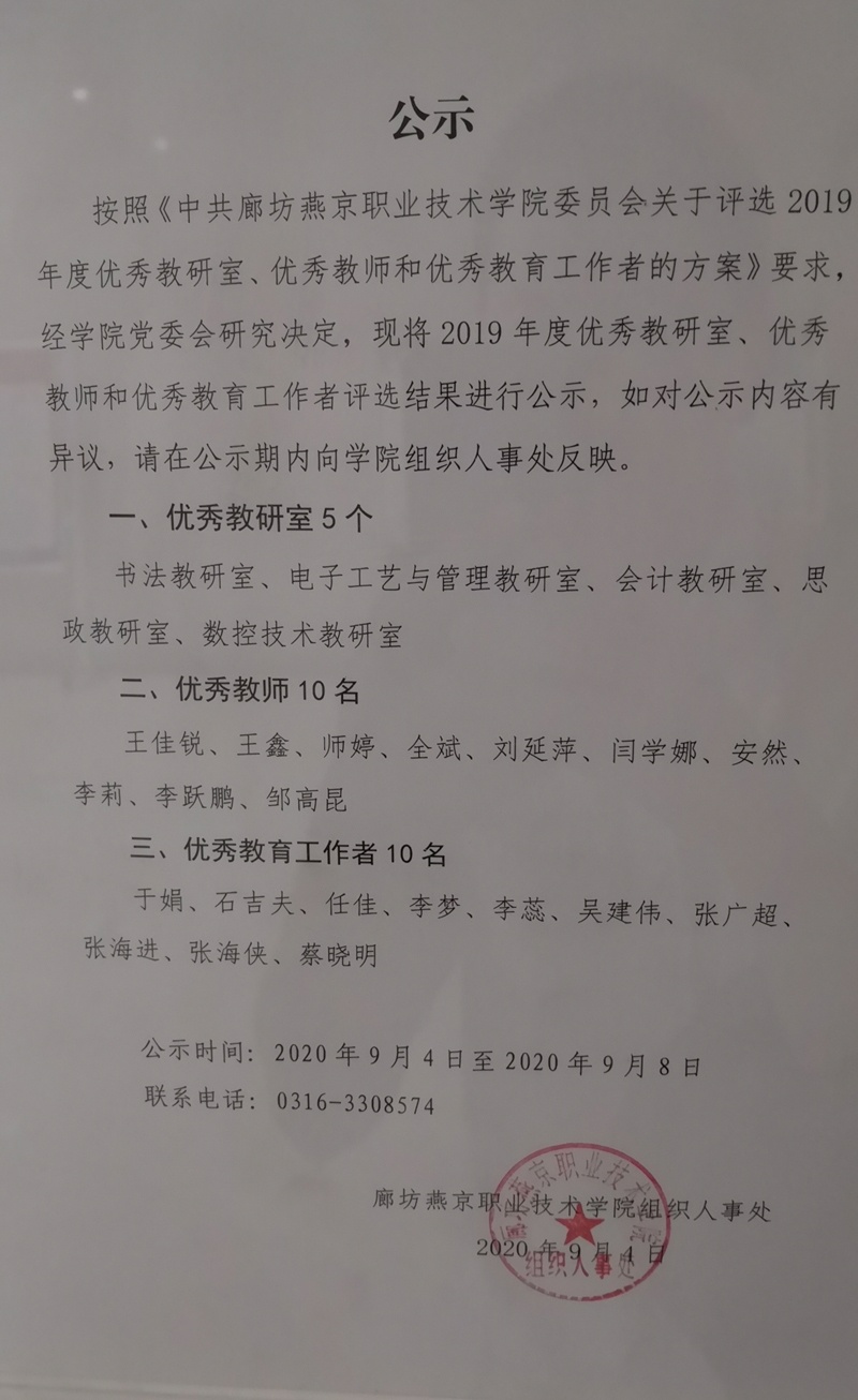 金年会app手机版在线登录关于2019年度优秀教研室、优秀教师和优秀教育工作者评选结果的公示