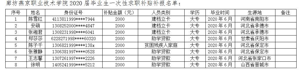 按照《河北省人力资源和社会保障厅、河北省教育厅、河北省公安厅、河北省财政厅、中国人民银行石家庄中心支行关于进一步做好当前形势下高校毕业生就业创业工作的通知》(冀人社[2019]266号)及《廊坊市人力资源和社会保障局、廊坊市教育局、廊坊市公安局、廊坊市财政局、中国人民银行廊坊市中心支行关于进一步做好当前形势下高校毕业生就业创业工作的通知》文件要求,对各高校、中等职业学校(含技工院校)毕业学年求职创业的低保家庭、贫困残疾人家庭、建档立卡贫困家庭和特困人员中的毕业生,残疾、烈士子女及毕业学年正在享受国家助学贷款的毕业生,给予一次性求职补贴,补贴标准每人2000元,不重复享受。经各系及学生工作处审核,金年会app手机版在线登录共有8名毕业生符合补报条件,现将名单公示如下,公示期为2020年5月20日至2020年5月26日。公示期间,如有异议,请拨打电话0316-3669104或15128941983。
