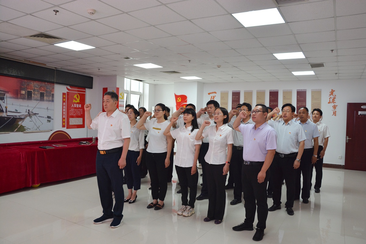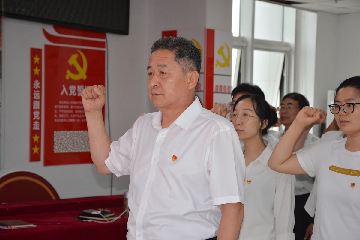 在重温入党誓词活动中,学院党委书记薛树林带领学院党委成员、中层领导干部和新党员在图书馆综合楼8层思政展厅,面向鲜红的中国共产党党旗进行了庄严的宣誓,铿锵有力的宣誓声响彻大厅。