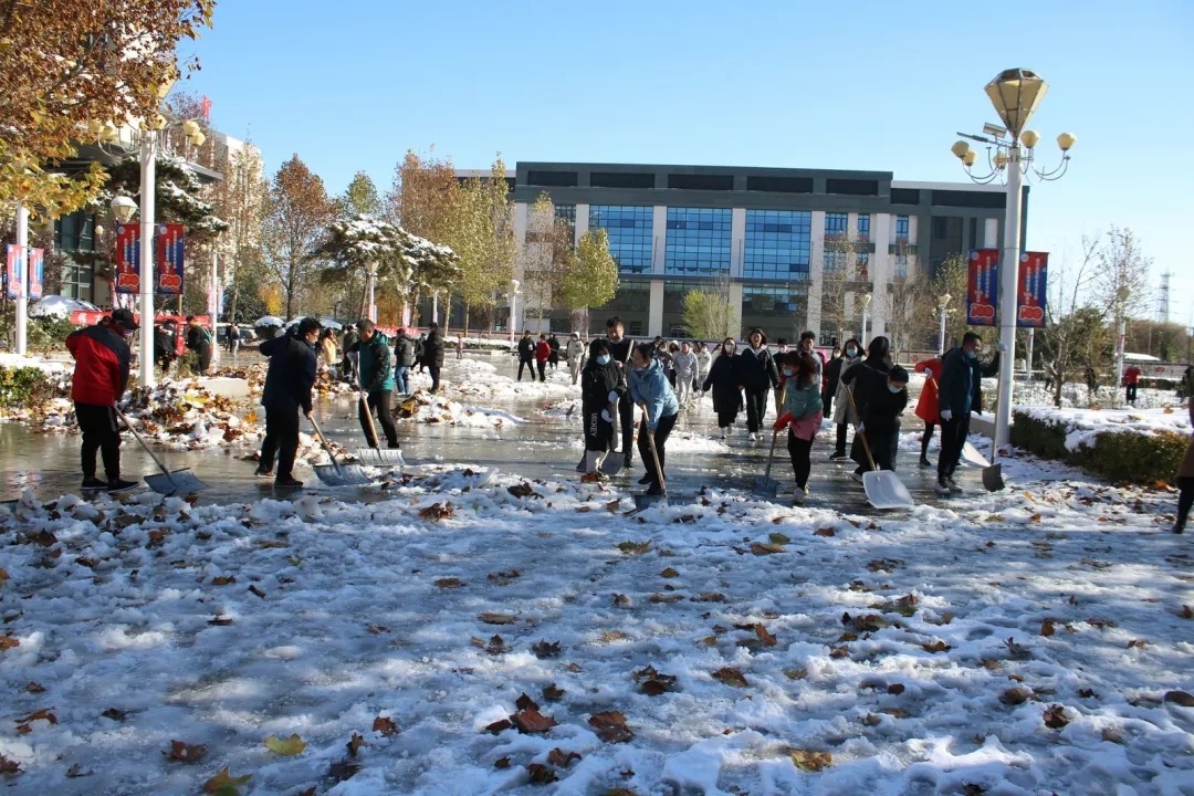 近日,受强冷空气影响,立冬节气,初雪飘然而至,一夜间,一场大雪将金年会app手机版在线登录校园点缀成银装素裹,玉树银花的世界。洁白无瑕的雪景不仅给人带来了美的享受,却也给人们的生活尤其是交通带来诸多不便。11月8日上午,学院积极组织领导干部和教职工对校园进行扫雪除冰活动。