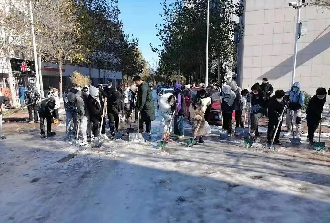 活动中,学院领导班子成员不惧严寒,率先垂范,拿起铁锹、雪铲等工具,带领广大教职工一起并肩努力。大家分工明确,默契合作,认真清扫校园内各主干道上和体育场上的积雪。天气虽然寒冷,但是大家劳动的热火朝天,忙碌的身影在皑皑白雪中形成一道道亮丽的风景线,经过两个多小时的齐心努力,终于将道路上积雪一扫而净,为师生开辟了一条洋溢着温情安全、畅通之路。