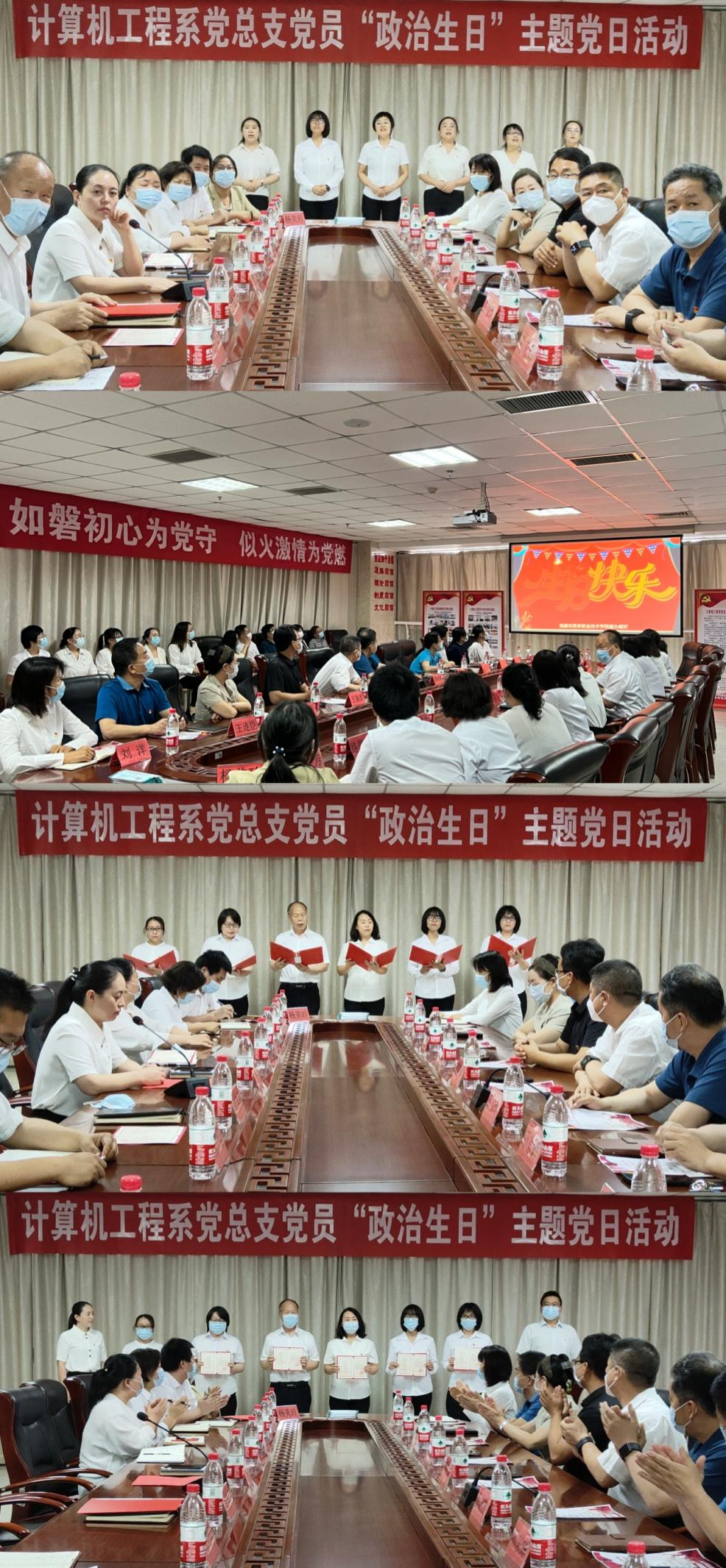 6月8日下午,计算机工程系党总支在图书馆1416室组织开展“如磐初心为党守 似火激情为党燃”党员“政治生日”主题党日活动,为6月份加入中国共产党的9名党员庆祝“政治生日”。活动邀请了学院党委书记薛树林同志,学院党委副书记、院长孙东辉同志,学院党委副书记刘增禄同志,党委委员、副院长林姿峰同志,党委委员、纪委书记王振波同志,党委委员、组宣处处长李宝东同志,纪委副书记杨清华同志,组宣处副处长王连臣同志,马学部副主任张淼同志莅临现场指导工作,各党总支(支部)代表到场观摩活动。计算机工程系全体党员参加活动,活动由系副主任艾华同志主持。