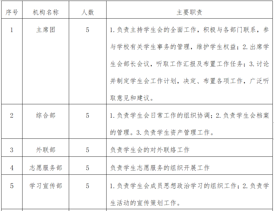 第八条 学生会组织工作人员规模不超过40人,其中主席团5人,下设综合部、纪检部、体育部、生活部、学宣部、志愿服务部等六个职能部门。