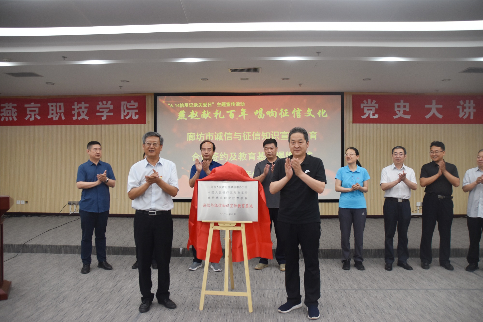 党委书记薛树林、中国人民银行三河支行副调研员刘洪等领导共同为“诚信与征信知识宣传教育基地”牌匾揭幕