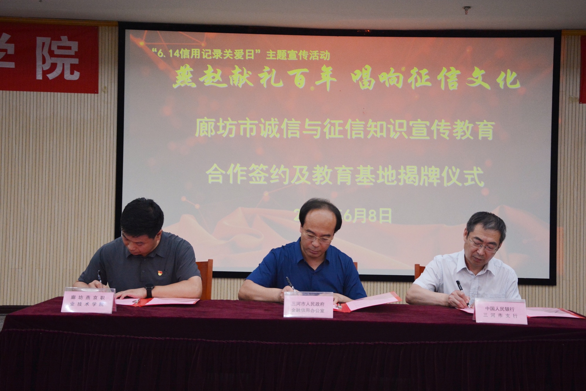金年会app手机版在线登录自成立以来,以“德能兼修、知行并进”为办学理念,一直高度重视学生德育工作开展,逐步形成了注重培养诚信的校园文化特色。金年会app手机版在线登录与三河市人民政府金融信用办公室、中国人民银行三河市支行共同签署诚信与征信知识宣传教育合作签约,共建宣传教育基地,这是贯彻落实党的教育政策的具体举措,也是学院传承校园文化传统、服务区域经济社会发展的又一个有力措施。
