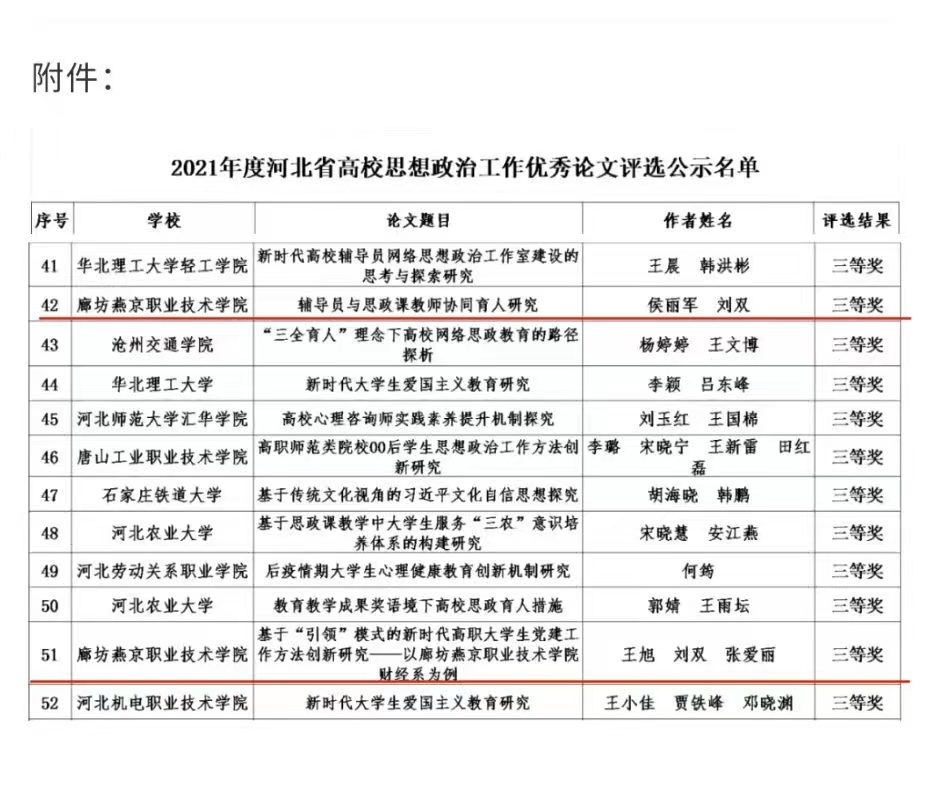近日,2021年度河北省高校思想政治工作优秀论文评选结果公示,我系辅导员王旭老师和侯丽军老师分别作为第一作者撰写的论文均获得三等奖。此次活动,经过河北省学校德育工作中心、高校思想政治工作队伍培训研修中心(河北师范大学)对论文进行文献检测、专家评审,共评选出优秀论文60篇,其中一等奖10篇,二等奖20篇,三等奖30篇。