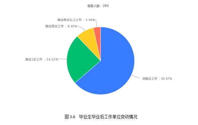 在被调查的289名毕业生中,184名毕业生没有更换过工作,70名毕业生更换过一次工作,25名毕业生更换过两次工作,10名毕业生更换过三次及以上工作。具体见图3.6: