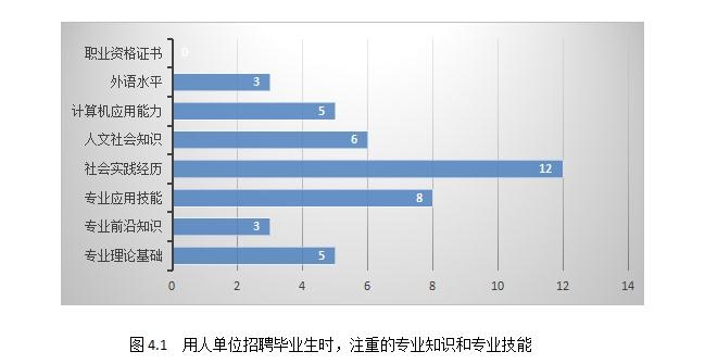 通过对15家用人单位的调查,可以看出用人单位在招聘毕业生是,最注重毕业生是社会实践经历,其次是专业应用技能,再次是人文社会知识,然后依次是计算机应用能力、专业理论基础、外语水平和专业前沿知识。具体见图4.1: